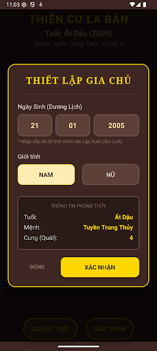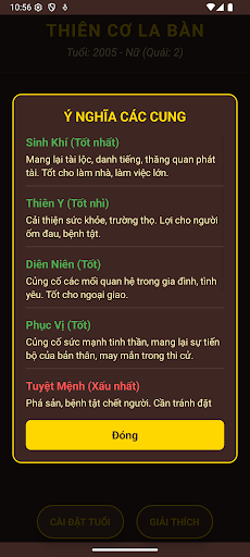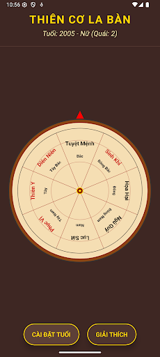 **Thien Co La Ban (Feng Shui Compass)** is an authentic, easy-to-use feng shui compass app specifically designed to help you determine auspicious and inauspicious directions for your home, workspace, or travel based on your birth year and gender (using the Bagua/Ba Zhai method). With a beautifully intuitive traditional interface and accurate astrological algorithms, this app is not just a measuring tool but also the ultimate guide to bring peace, prosperity, and good fortune into your life. **MAIN FEATURES:** - **Absolute Accuracy:** Uses your device's built-in magnetometer to accurately measure the direction of your home, front door, and workspace. - **Personalized Kua Number Calculation:** Simply enter your birth year and gender. The application will automatically calculate the Kua number (Li, Kan, Zhen, Xun, Qian, Kun, Gen, Dui) and elemental destiny (Metal, Wood, Water, Fire, Earth). - **Analysis of 8 Feng Shui Directions:** The compass immediately displays 4 auspicious directions (Life Energy - Wealth, Heavenly Will - Health, Yang Year - Relationships, Restoration - Stability) and 4 inauspicious directions (Nine Darkness - Total Loss, Five Ghosts - Five Elements, Flowing Sand - Six Killings, Calamity - Disaster) specifically designed for your sector. - **Detailed Explanation:** The integrated guide clearly explains the meaning of each directional star, helping beginners understand and apply Feng Shui principles immediately. - **Smooth & Elegant Design:** Optimized for smooth, lag-free operation, with an elegant and beautiful traditional Eastern design. Let **Thien Co La Ban** accompany you in creating a harmonious living space, attracting positive energy and warding off bad luck!