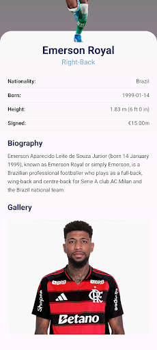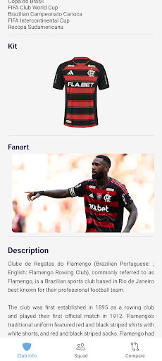 Guide Flamengo FC is the definitive companion for every Guide Flamengo FC supporter. Created by fans for fans, this app immerses you in the world of the "Guide Flamengo FC" with comprehensive data on the squad, the DRV PNK Stadium, and the club's legendary history. Key Features: Club Insights: Dive into the rich history, trophy cabinet, and stadium facts. Squad & Players: Detailed profiles including biographies, physical stats, and transfer info. Player Comparison: Analyze stars head-to-head with our intuitive comparison tool. Fan Community: Stay connected with quick links to official social channels. Disclaimer: This is an unofficial fan application and is not affiliated with Guide Flamengo FC Football Club.