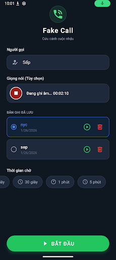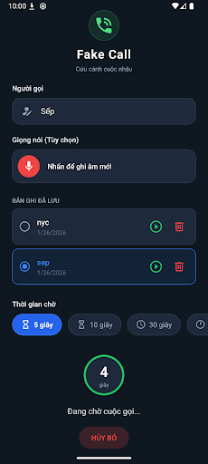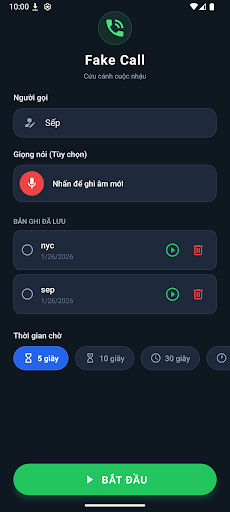 Stuck in a drinking party with no way out? Is your date getting boring and you want to leave early? Or do you simply need a valid excuse to disappear immediately? Boss Calling! is the perfect rescue app for you! With Boss Calling!, you can create a 100% realistic fake incoming call on your phone. With just a few simple steps, your phone will ring at the right moment, giving you the perfect excuse: "Sorry guys, my boss is calling urgently, I have to go!" or "My wife is calling, if I don't go home now, I'm in trouble!". KEY FEATURES: • 100% Realistic Interface: The incoming call screen is designed to look exactly like the default interface, no one can detect that you are "acting". • Voice Simulation: Record the voice of your Boss, Wife, or relatives yourself. When you pick up, the speaker will play this recording, making people nearby believe it without a doubt! • Script Library: Save frequently used recordings and scenarios (e.g., Boss calling for a meeting, Wife asking to pick up kids, Shipper delivering...) to activate quickly at any time. • Smart Timer: Set the ringing time as you like (after 5s, 10s, 1 minute...). Just relax, and right on time, "Boss" will call to rescue you! • Flexible Customization: Freely name the caller (Boss, Wifey, Crush...), choose ringtones, and vibration patterns just like a real call. • Offline Operation: Rescue you anytime, anywhere even without an internet connection.